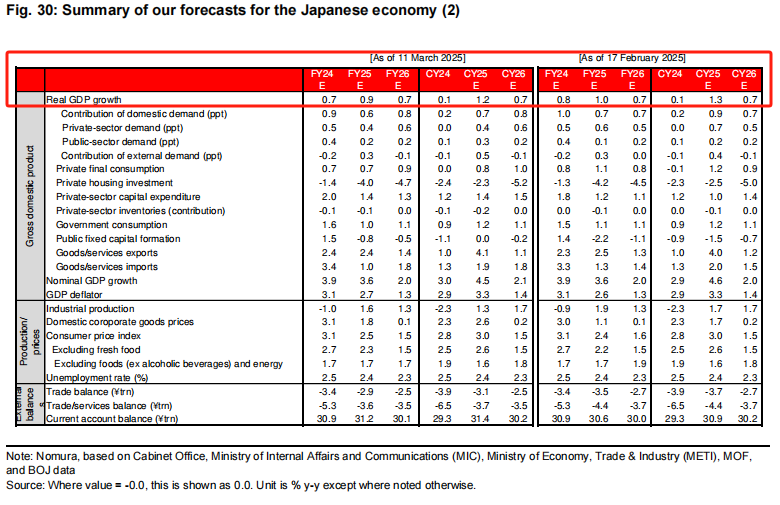 日本经济正面临多重挑战,野村证券预计日本2024财年实际GDP增长率将为0.7%、2025财年为0.9%、2026财年为0.7%,较之前0.8%、1.0%和0.7%的预测有所下调。