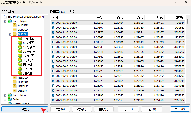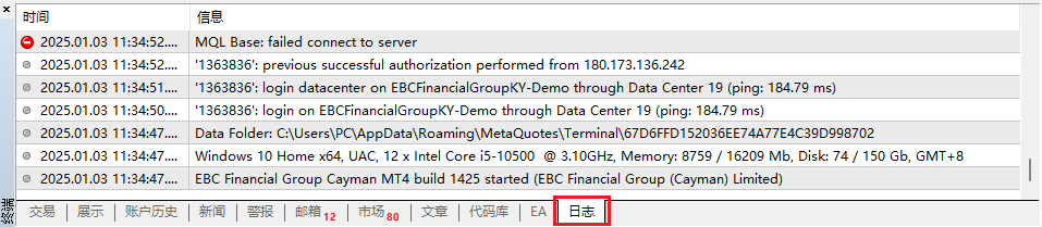 *历史数据下载记录可在MT4“终端-日志”中查看