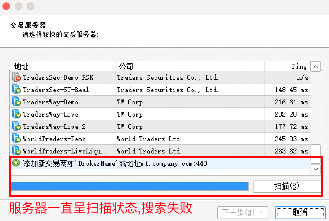 当在苹果电脑端MT4中登录交易账号出现服务器无显示时需要重新添加服务器