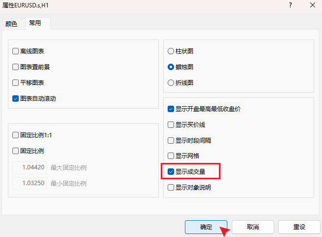 成功调取成交量显示后,交易者可以继续通过图表属性窗口设置成交量的显示颜色,但无法更改其显示样式。(图表属性窗口打开:图表窗口右键菜单/主菜单栏图表)