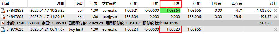 终端窗口查验:挂单止盈价位应用成功