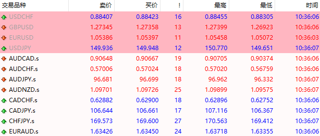 显示实时价格信息,包括买入价(Bid)和卖出价(Ask),两者之间的差额即为点差。大多数经纪商平台会根据交易品种的类型使用不同的颜色进行区分,同一类型的品种会显示相同的颜色。
