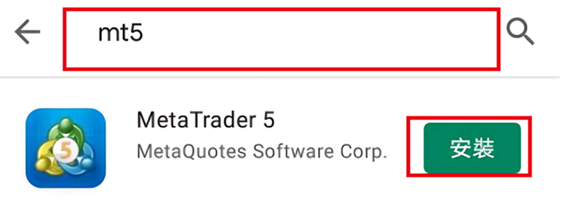 2、输入“MT5”查找应用,出现结果后点击“安装”