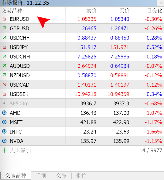 (注意,交易订单栏中只提供在报价窗口中显示出来的交易品种)