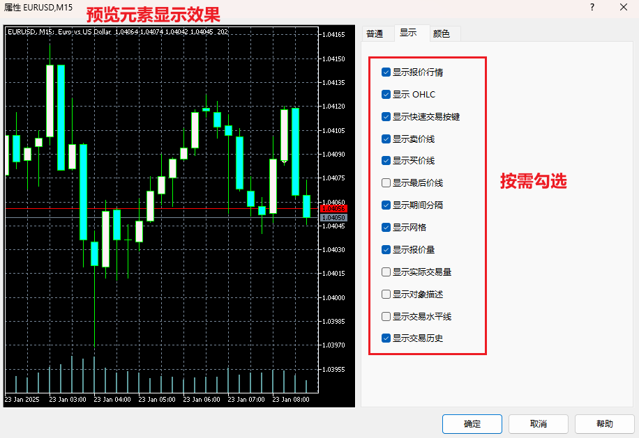 在使用上述方法成功将MT5图表设置为K线图后,想要进一步调整图表的显示效果,仍需在属性窗口(F8调出)进行设置。