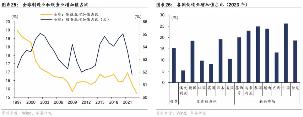 過去,伴隨着全球化,全球供給端的產業結構呈現出“製造業佔比下降但集中化、服務行業佔比提升”的特徵。而“大沖撞”時代,各國推動產業鏈迴流和多極化佈局,可能對全球範圍內的供給端結構帶來幾點影響: