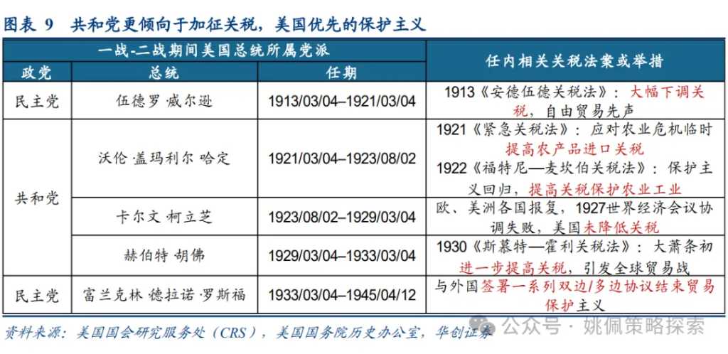 3、政治視角:共和黨執政,主張“美國優先”的保護主義,1929年胡佛上任后主張加关税以保护农民权益。美國共和黨依賴北方工業集團及本土製造商構成的核心票倉,傾向保護本土工業免受國外產品競爭壓力。民主黨作爲南方農業州及出口導向型產業的政治代言人,通常主張削减关税,降低進口原材料成本並促進出口。由於1920年代關稅政策並未解決農業衰退問題,1928年共和黨候選人胡佛在競選活動中提到“我們國家今天最緊迫的經濟問題是農業。我們必須解決這個問題,才能直接爲三分之一的人民帶來繁榮和滿足”。而在政策路徑上,共和黨以成本高昂爲由拒絕實施農業補貼,同時爲了保護工業集團利益不願意通過降低工業品的保護性關稅來降低農戶成本。最終,提高農業關稅成爲了唯一的解決辦法。