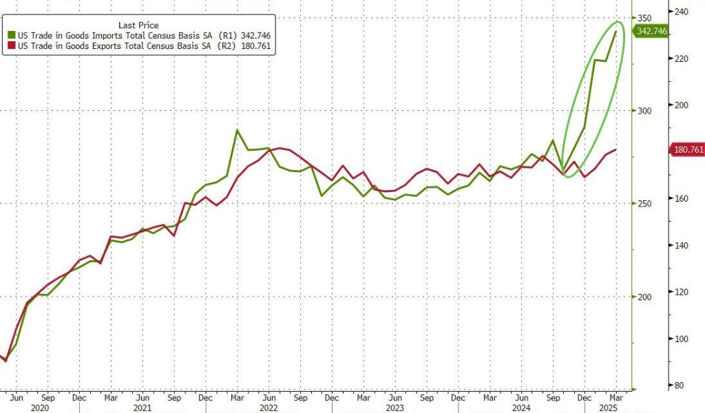 在企業紛紛“搶進口”以規避關稅的情況下,美國3月份的商品貿易逆差急劇增加,達到了歷史最高水平。