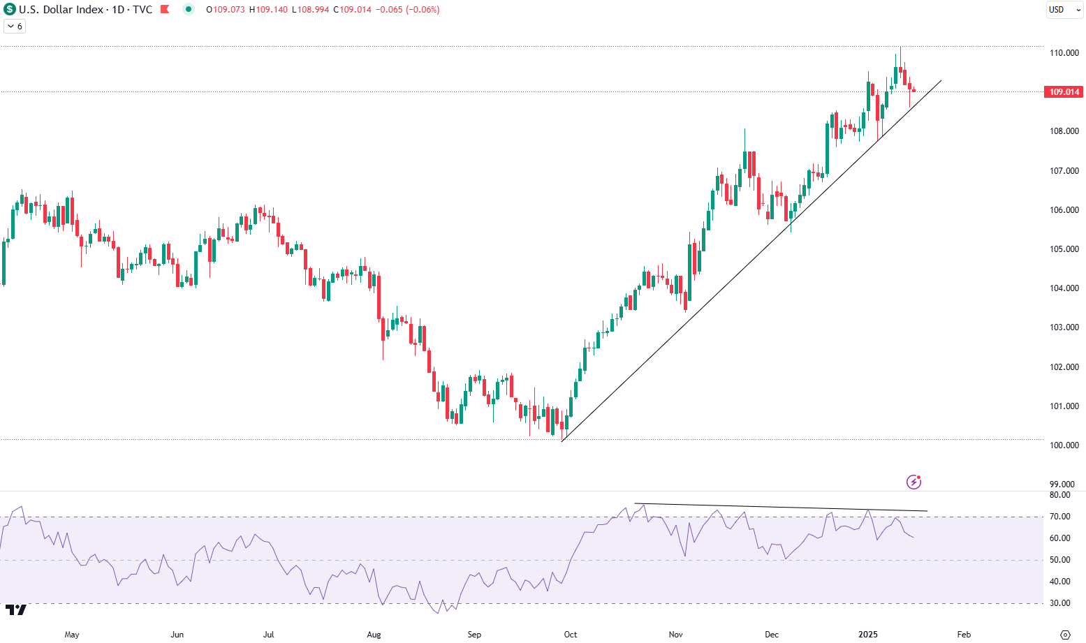美元指數從9月末以來上漲近10%(下圖),其背後有降息預期降溫的推動,也有貿易戰威脅的助力以及避險情緒的醞釀。若能守住上升趨勢線,多頭的下一個重要目標為2022年9月高點114.80,但圖中的背離走勢也不可忽視。