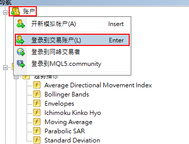 交易軟體頁面找到導航窗口,“帳戶”→“登录到交易帳戶”