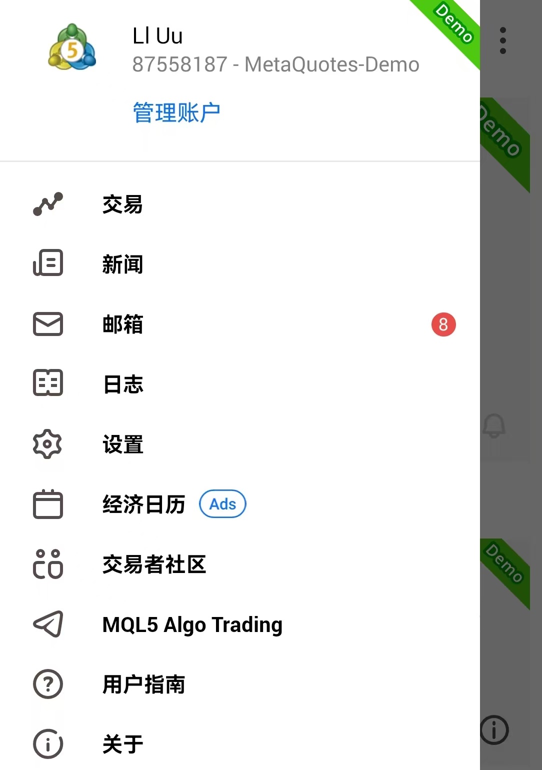 1、MetATRader 5安卓手機端邊欄設定項目清單如圖所示