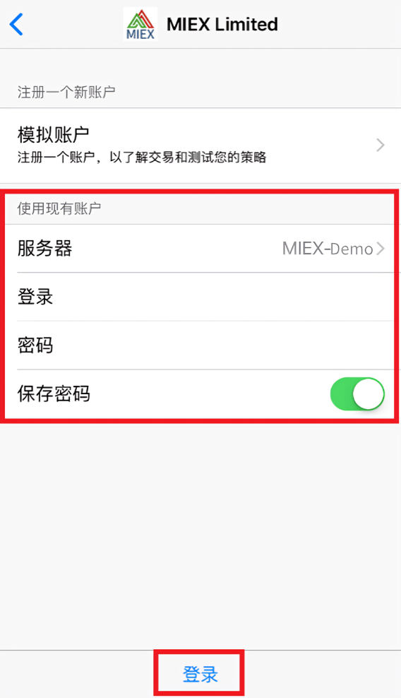 *填寫你在應用程式內註冊過的經紀商模擬帳號信息,注意選擇模擬伺服器(Demo)
